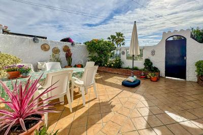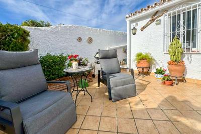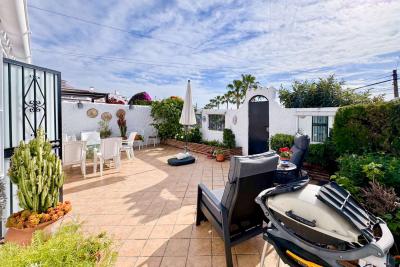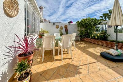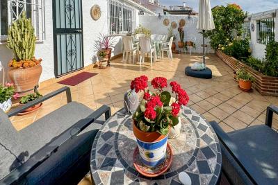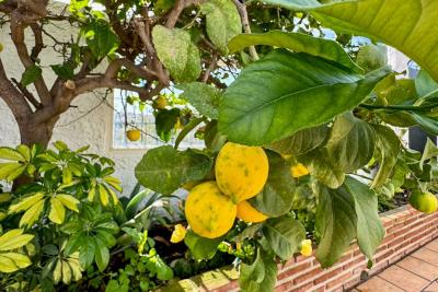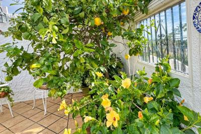 Huset har en rymlig och solig terrass, perfekt för att njuta av soliga dagar, härliga grillkvällar eller middagar utomhus. Terrassen pryds av planteringskärl med ett citronträd och flera vackra blommor, vilket skapar en naturlig och inbjudande atmosfär.